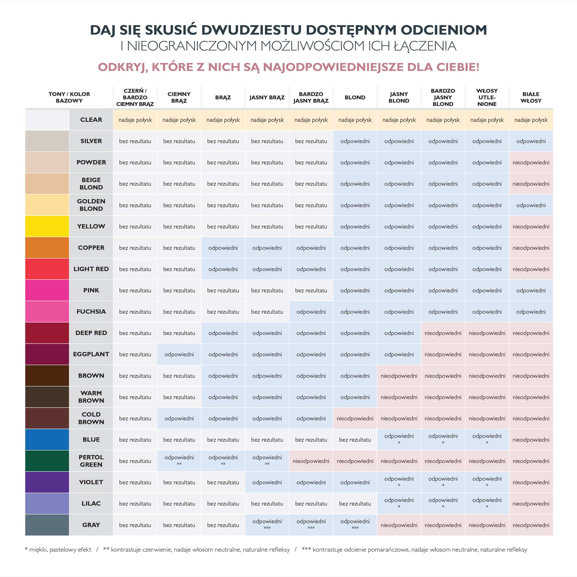 - Na ciemniejszych lub bardziej intensywnych odcieniach zalecamy mycie delikatnym szamponem.